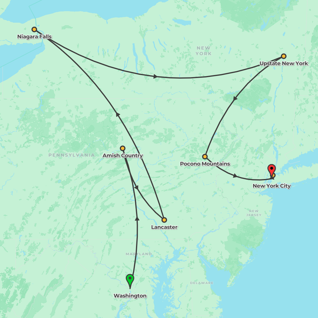 Experience New York City, Niagara Falls, Philadelphia, and Washington DC on a multi-city adventure with guided sightseeing, a Niagara Falls cruise, and an extended stay in New York.