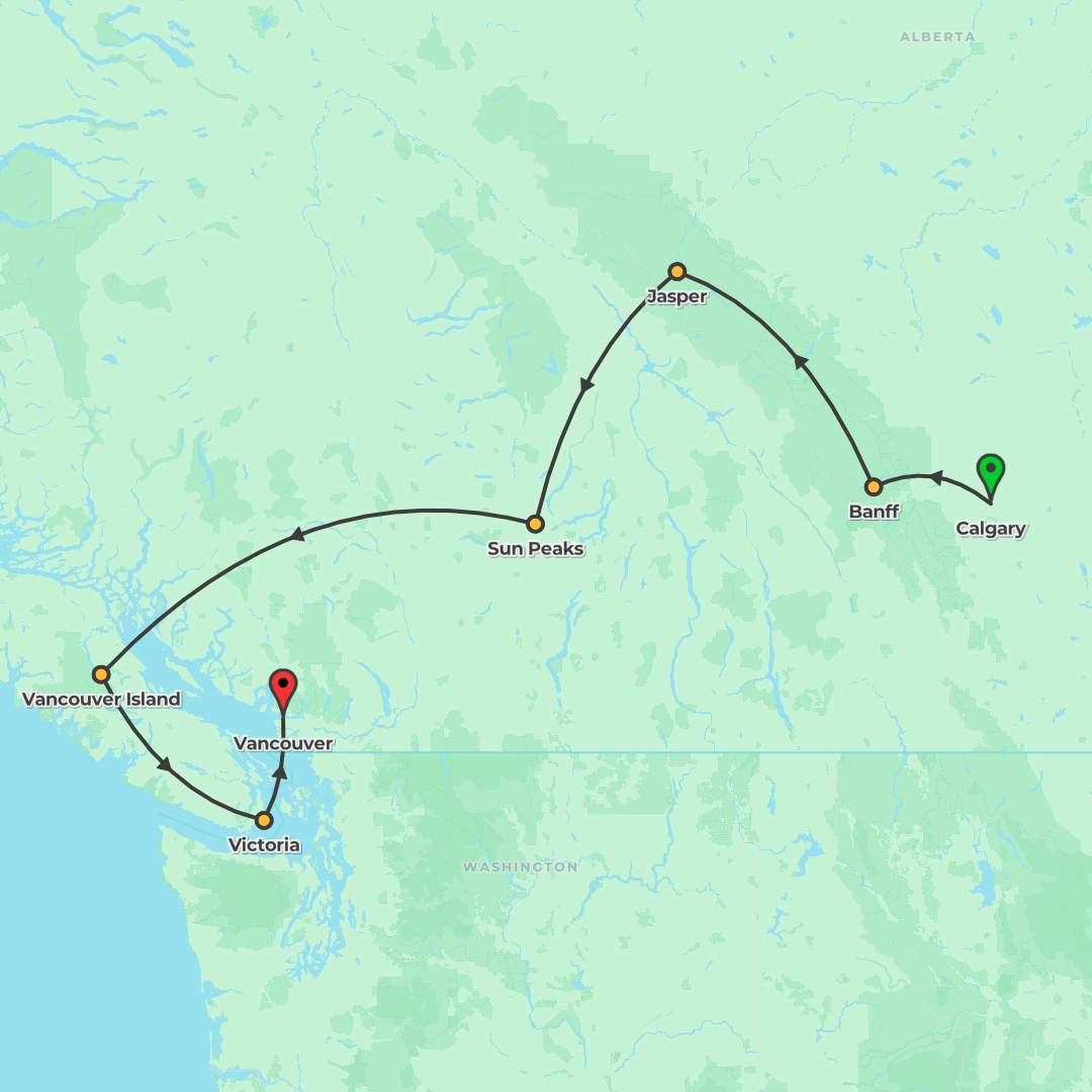Discover Canada’s Rockies and Pacific Coast on a guided journey from Calgary to Vancouver with scenic drives, a coastal ferry crossing, and rewarding walks in national parks and on Vancouver Island.