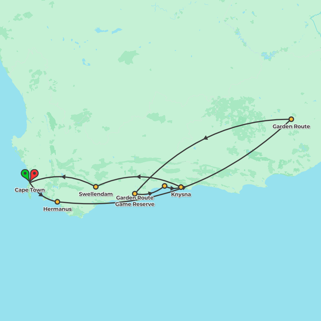 A premium adventure through South Africa’s Garden Route from Cape Town to a private game reserve, blending city highlights, Winelands tastings, caves, coast and wildlife.