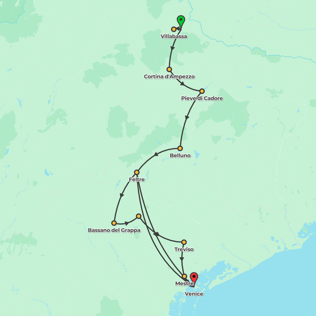 Cycle self-guided from the Dolomites to Venice through scenic villages and waterways, staying in comfortable 3–4 star hotels with luggage transfers and bikes included.