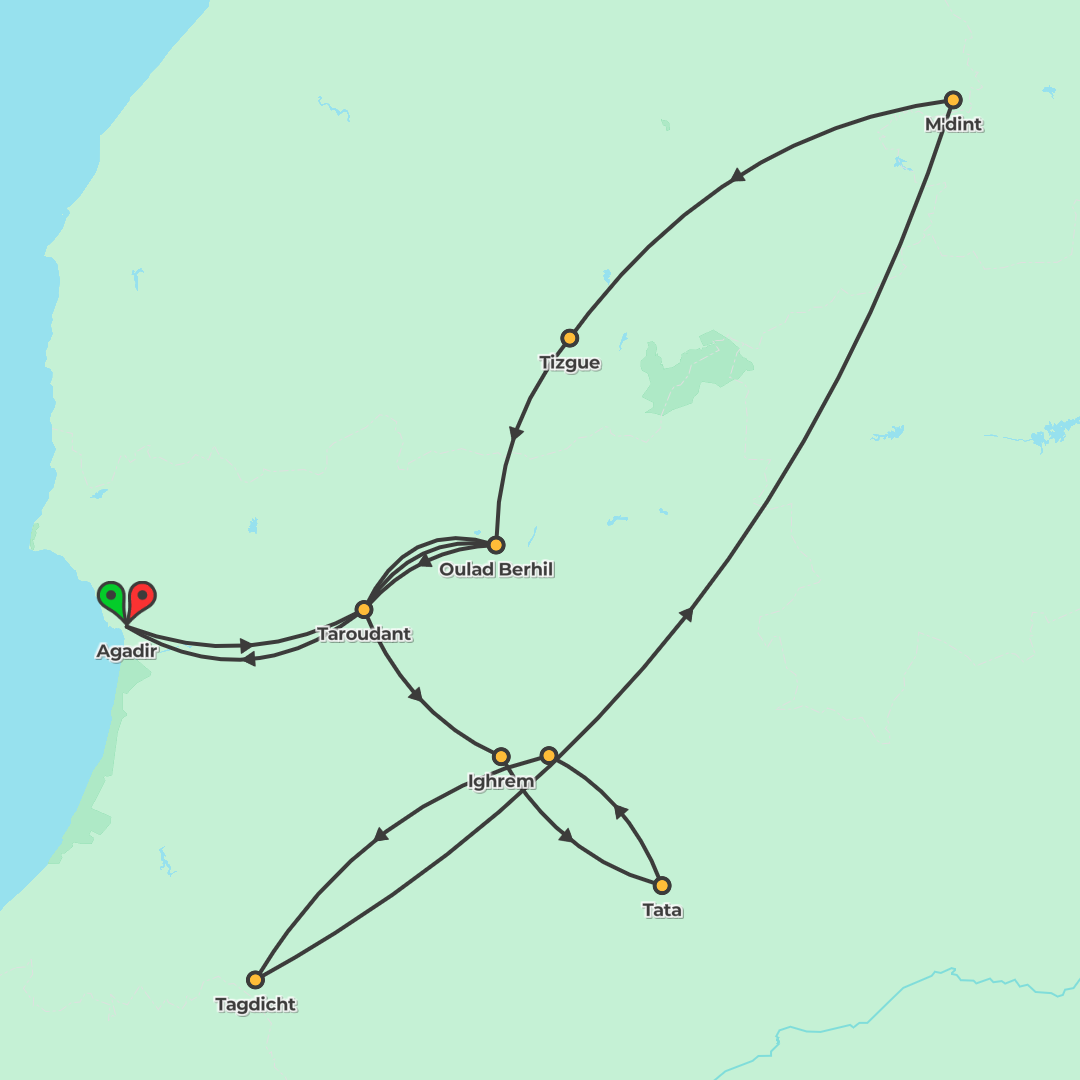 As we make our way through the Anti-Atlas peaks, we spend our nights wild camping, while our first night is spent in a hotel in Agadir and our final night is at a riad in Taroudant.