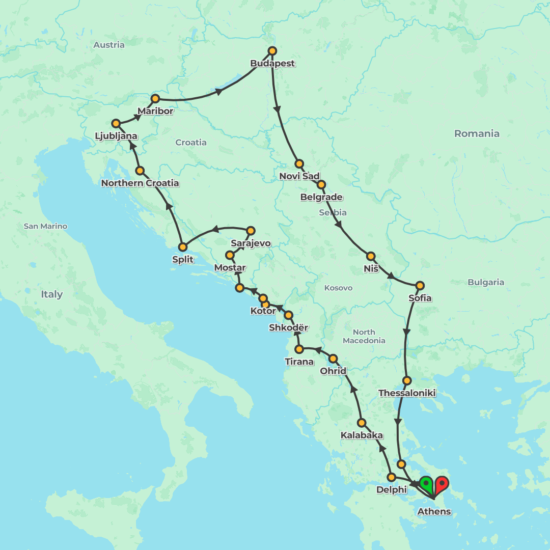Explore the Balkans on a 16-day, fully guided coach tour from Athens, visiting multiple countries and iconic sites with free time in Dubrovnik and Budapest.