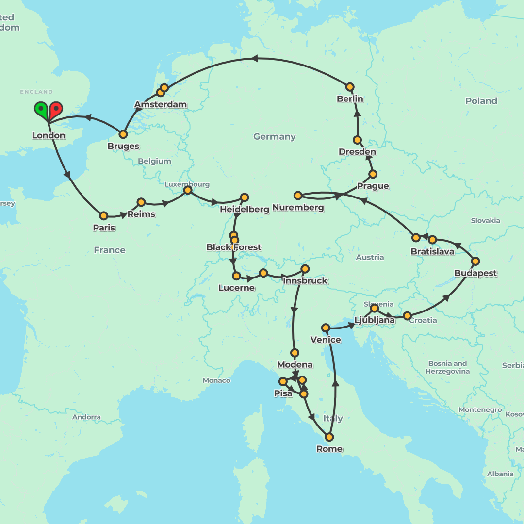 A summer European overland adventure from London to Paris via Amsterdam, Berlin, Prague, Vienna, Kraków, Budapest, the Swiss Alps and Italy, with hotel stays, plentiful breakfasts and select dinners,