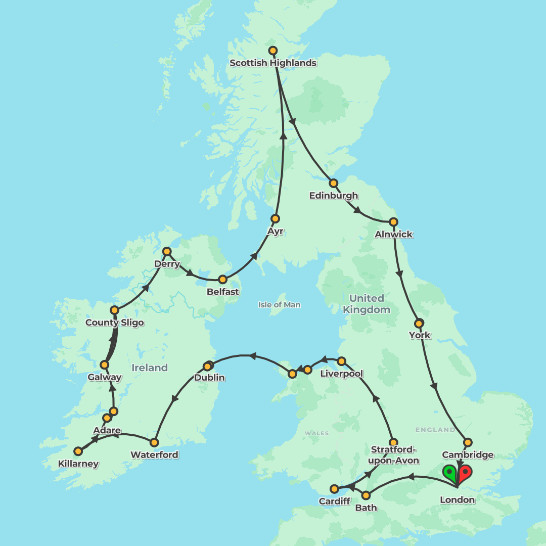 An 18‑day coach adventure from London through England, Scotland, Northern Ireland and Ireland, featuring city highlights, a high‑speed ferry crossing and a Loch Ness cruise, with free time and optiona