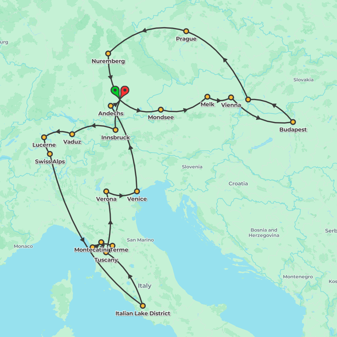 Experience a fully guided journey from Munich through the Alps to Vienna, Budapest and Prague, blending iconic landmarks with free time across eight countries by comfortable coach.