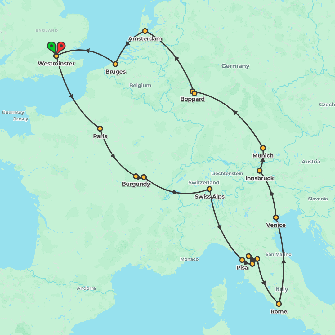 Explore iconic cities and alpine landscapes on a fully guided coach tour starting and ending in London, with comfortable hotel stays and free time to discover Paris, Switzerland, Italy, Germany and th