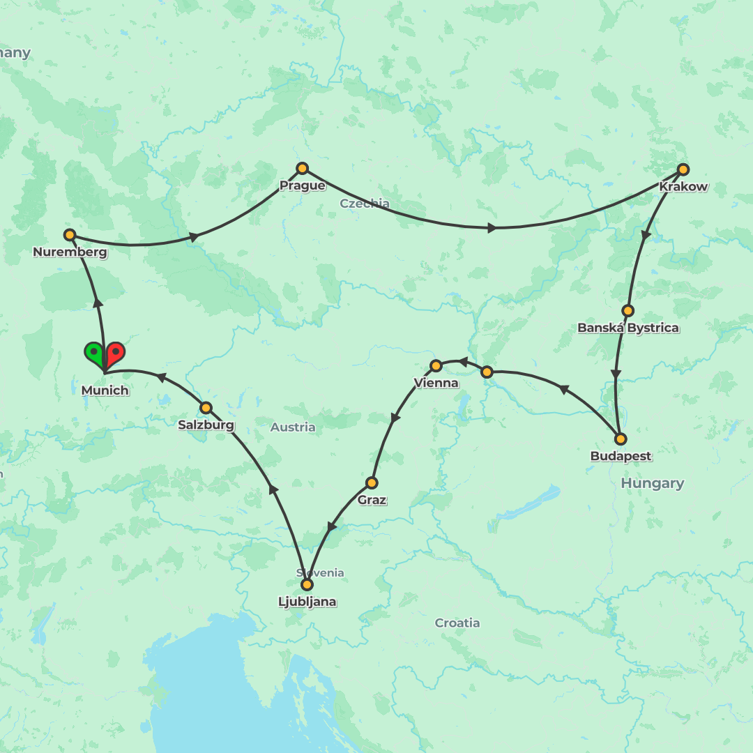 Discover Eastern Europe on a fully guided coach adventure from Munich through Prague, Krakow, Budapest, Vienna and Ljubljana, with free days to explore and unforgettable stops at Auschwitz, Lake Bled