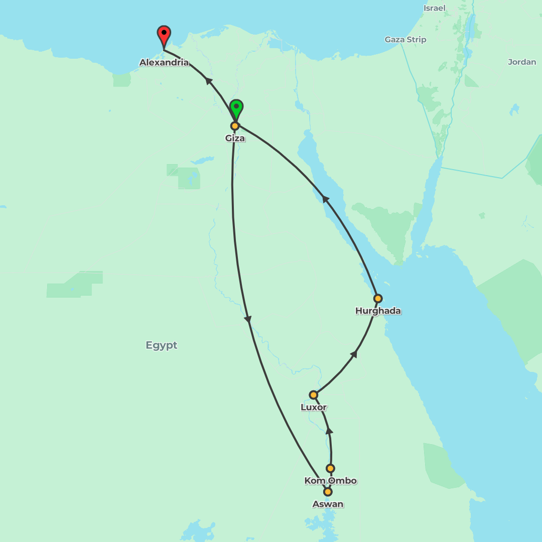 Discover Egypt and Jordan from Cairo to Amman with 5- and 4-star stays, a 5-star Nile cruise, Wadi Rum desert camp and Petra, plus Red Sea time in Dahab.