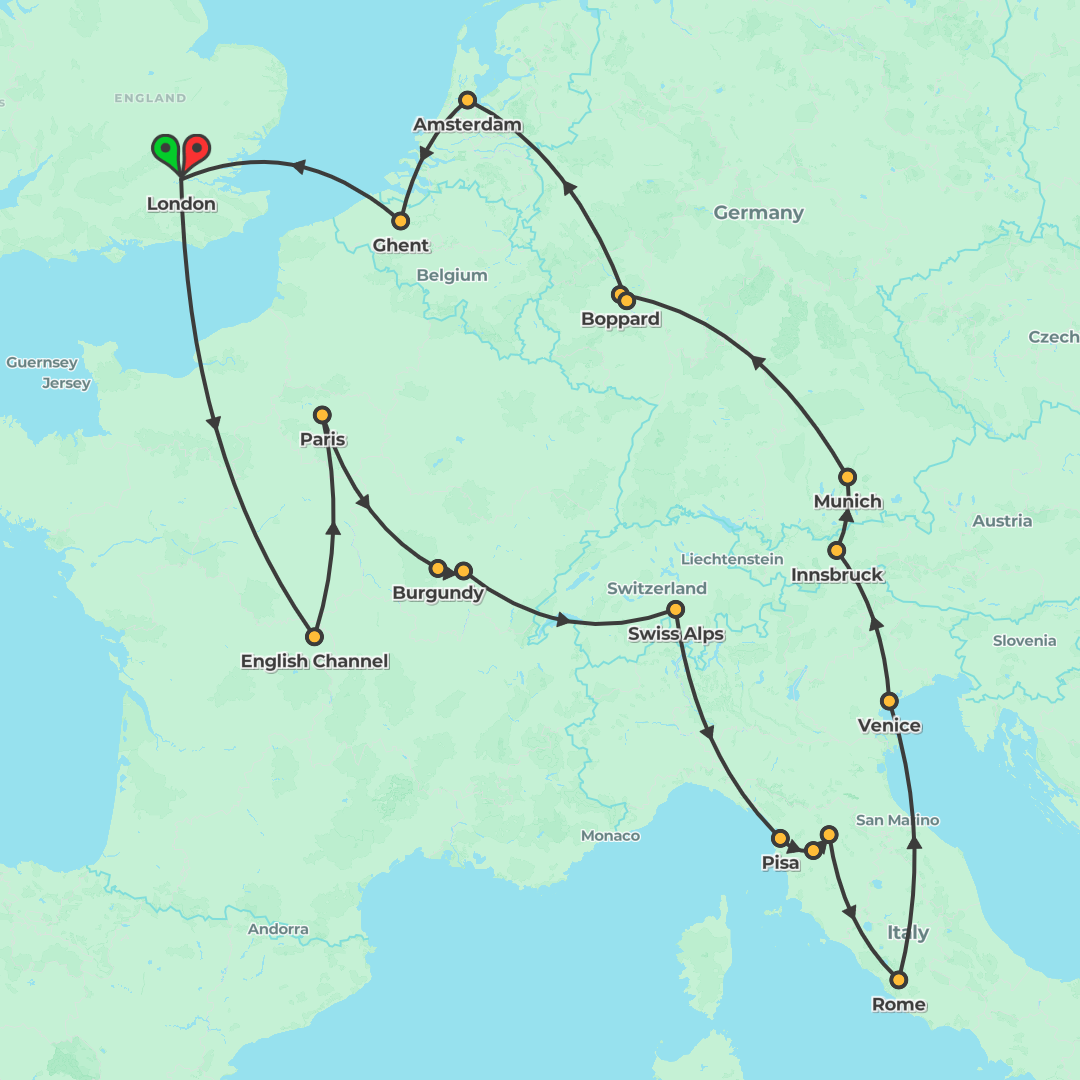 Discover Europe on a 14-day journey from London to Amsterdam, taking in Paris, the Swiss lakes, Italy’s icons, Austria and the Rhineland with guided sightseeing, comfortable hotels and coach travel.