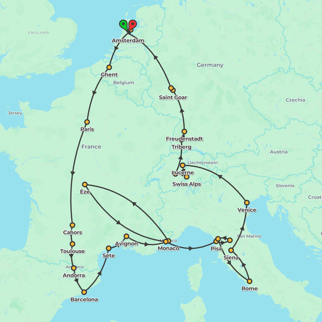 Embark on a classic group journey from Paris to Amsterdam, tracing France, Spain, Monaco, Italy, Vatican City, Slovenia, Austria, Liechtenstein, Switzerland and Germany with expert-led sightseeing, sp