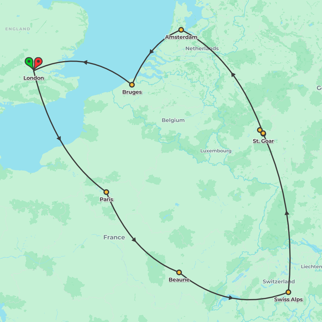 Discover Europe on a 14-day journey from London to Amsterdam, taking in Paris, the Swiss lakes, Italy’s icons, Austria and the Rhineland with guided sightseeing, comfortable hotels and coach travel.