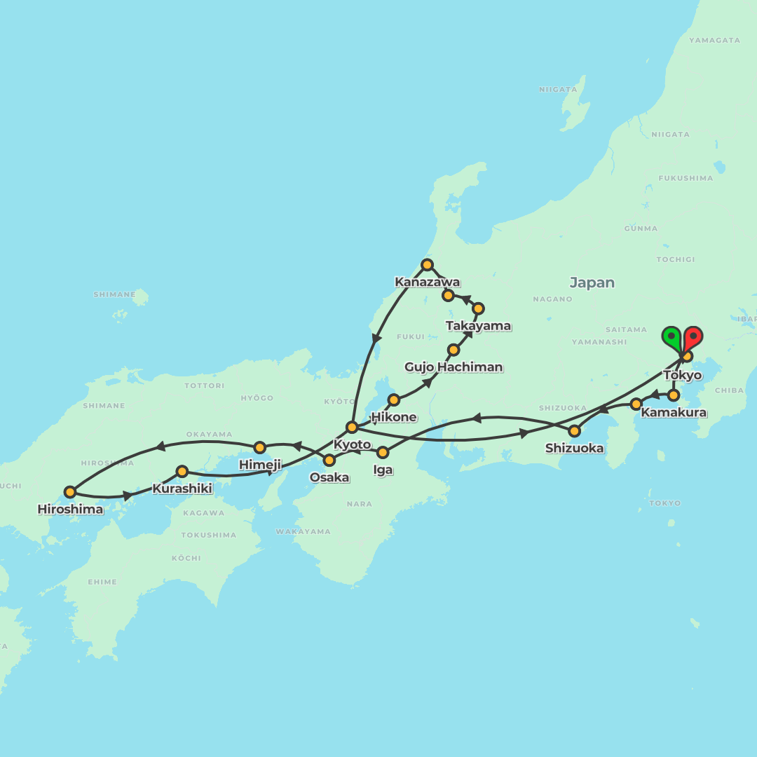 Journey from Tokyo to Osaka, taking in Mt. Fuji, Takayama, Kanazawa, Kyoto, Awaji Island, Miyajima and Hiroshima, with cultural experiences and a night in a traditional ryokan.