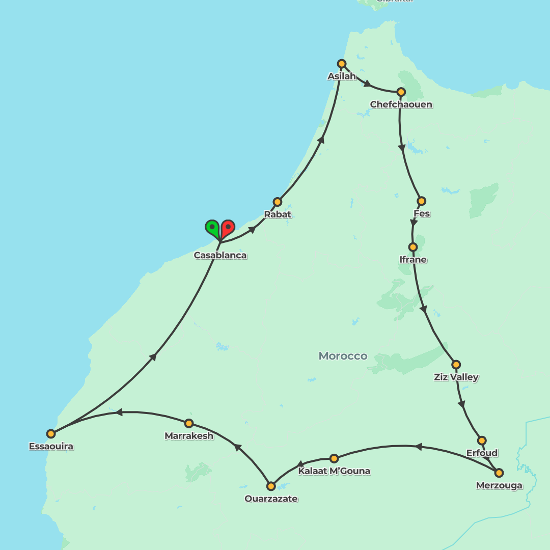 Explore Morocco’s imperial cities, mountain passes, Sahara camps and Atlantic towns on a three‑week journey roundtrip from Marrakech, blending guided walks with time to relax in Essaouira and Mirleft.