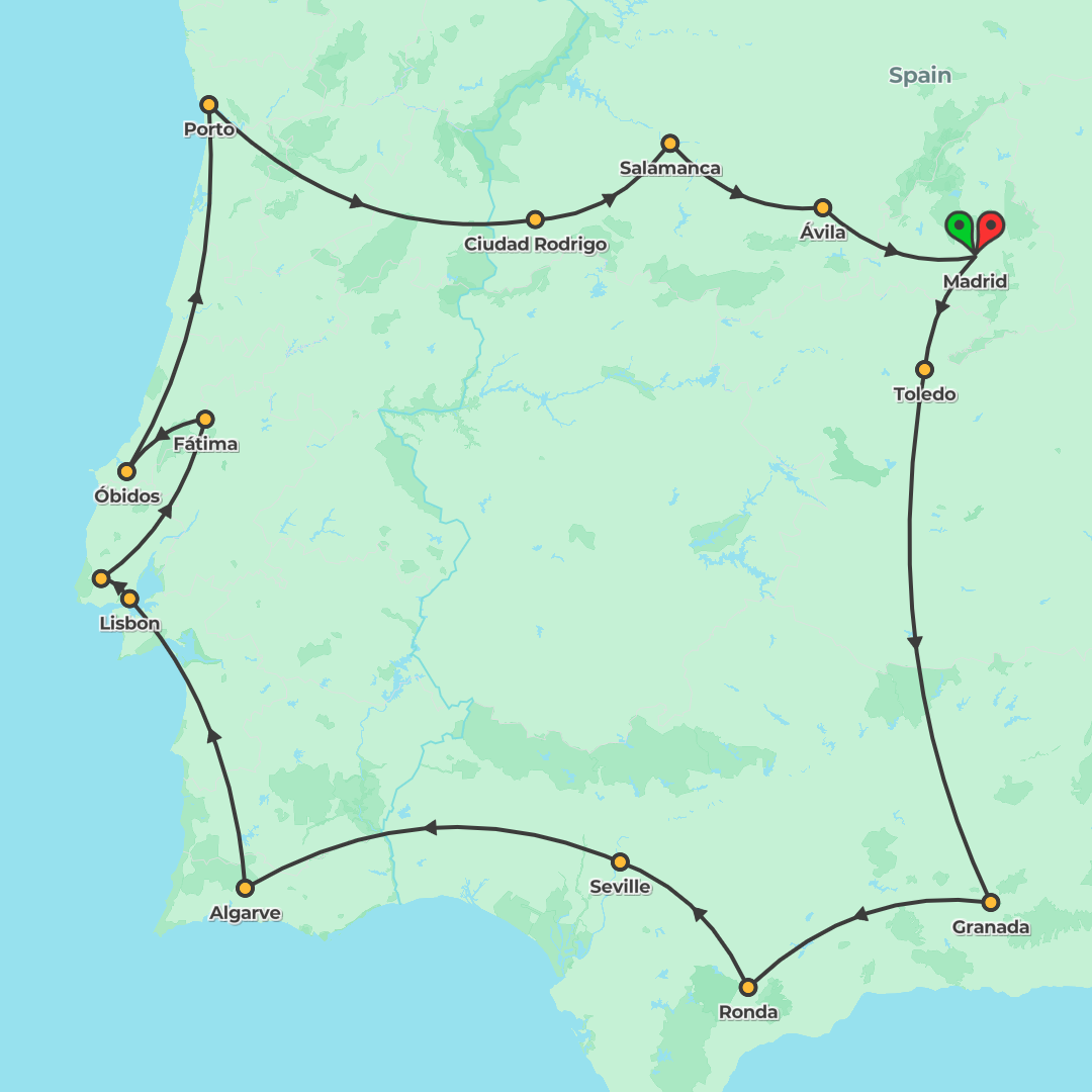 Discover Spain and Portugal on a 9-day guided journey from Madrid through Toledo, Granada, Seville, Évora and Lisbon to Fátima, Salamanca and Ávila, with Local Expert-led visits and included meals, be