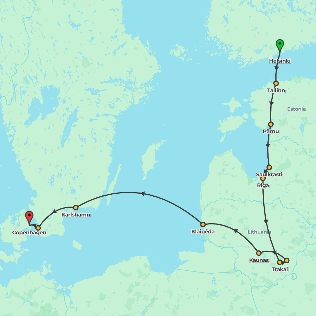 Journey from Copenhagen to Stockholm through Germany, Poland, the Baltic capitals and Finland on a first-class itinerary featuring coach travel, Baltic Sea ferry crossings, and included city sightseei