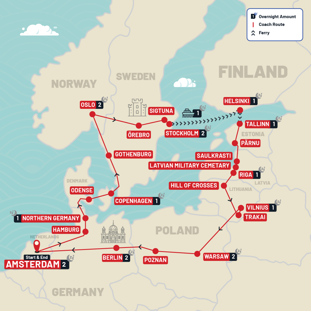 Journey from Amsterdam through Scandinavia and the Baltics on an 18-day fully guided coach tour featuring iconic capital cities, scenic drives and unforgettable ferry crossings.