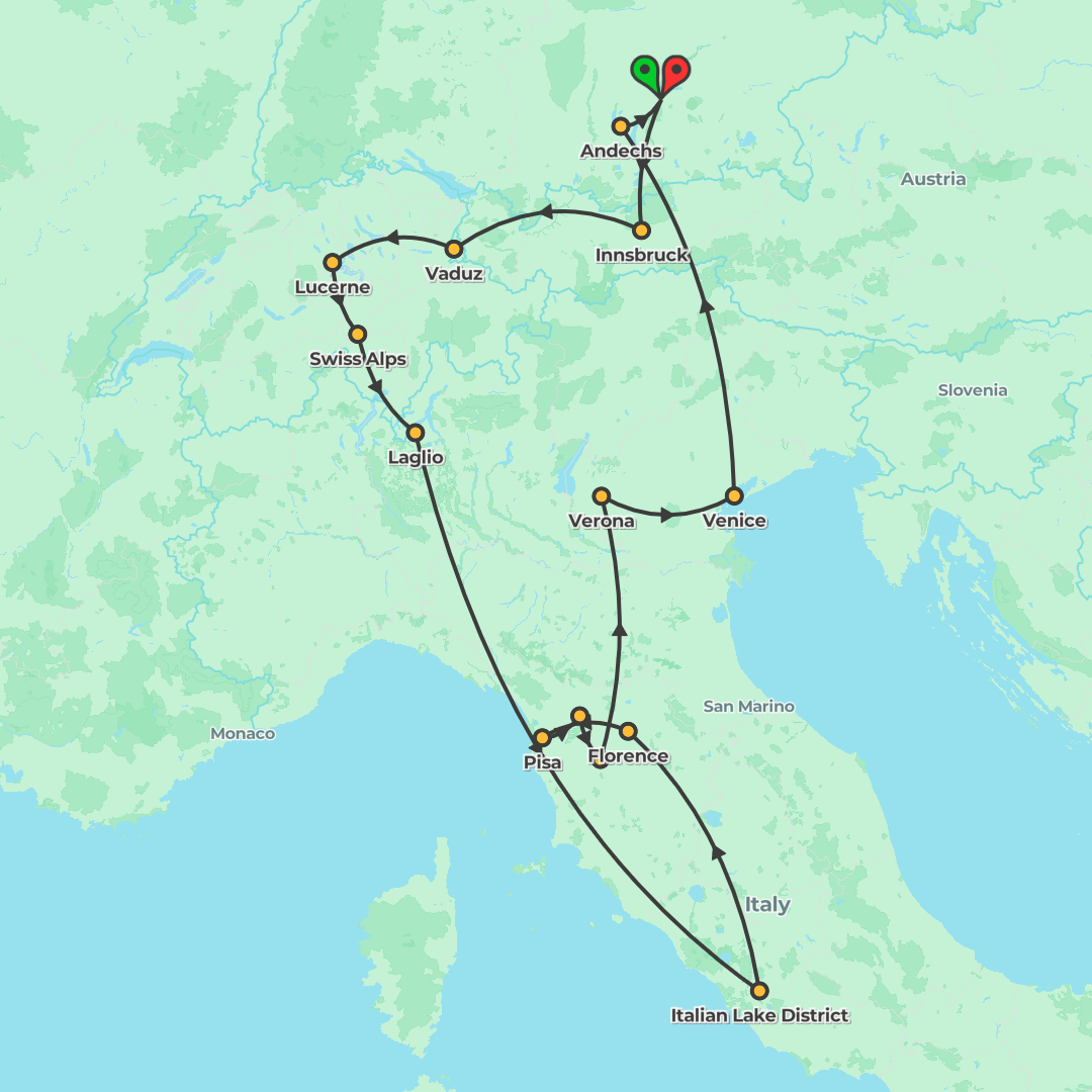 Explore Germany, Austria, Liechtenstein, Switzerland and Italy on a fully guided coach tour from Munich, with comfortable hotel stays and iconic highlights from Neuschwanstein and the Swiss Alps to Fl