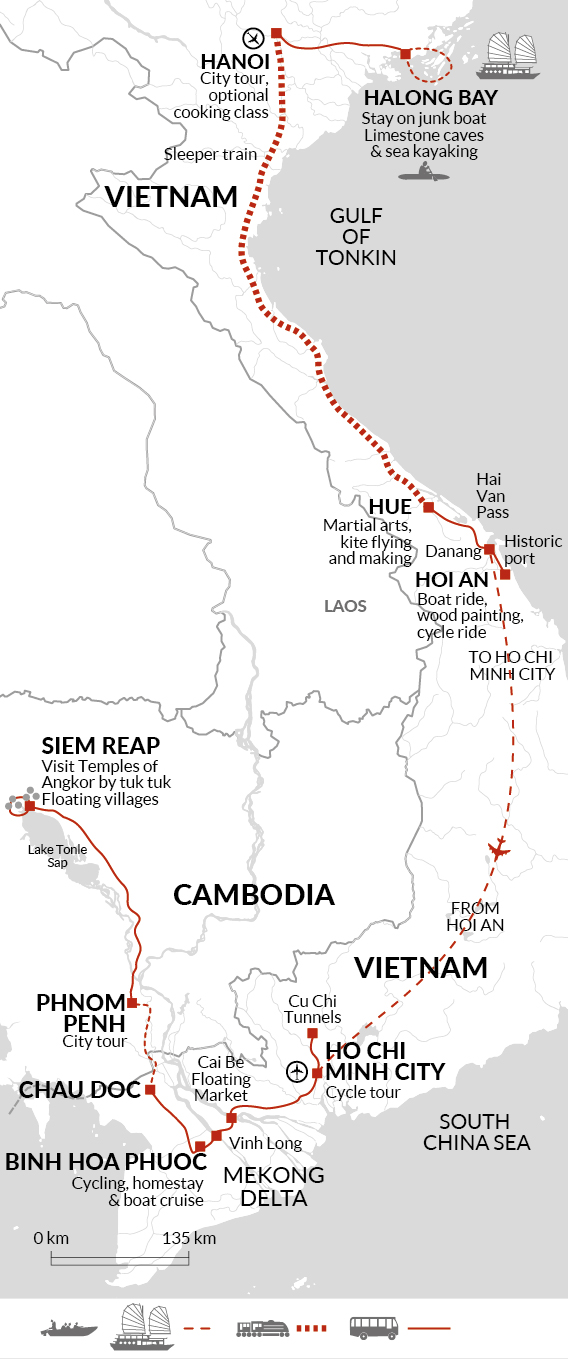 Discover Vietnam and Cambodia from Hanoi to Phnom Penh, combining city highlights, a Halong Bay cruise, cultural encounters and convenient flights between key destinations.