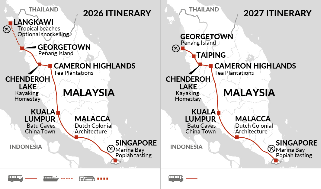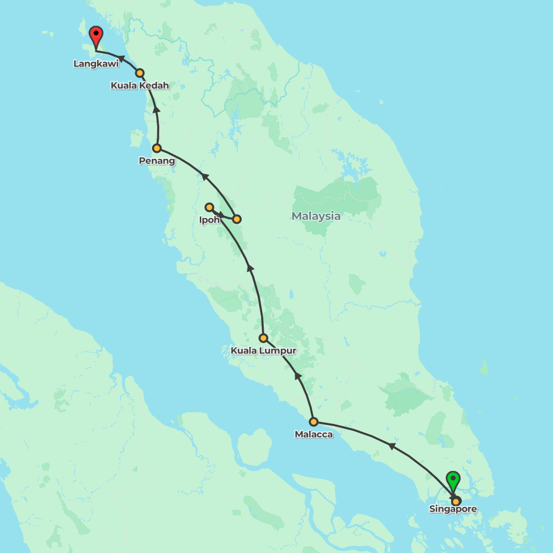 From Singapore’s vibrant districts to Malaysia’s Malacca, Kuala Lumpur, Cameron Highlands, Penang and Langkawi, this guided journey blends city exploration, rural homestay experiences and island time.