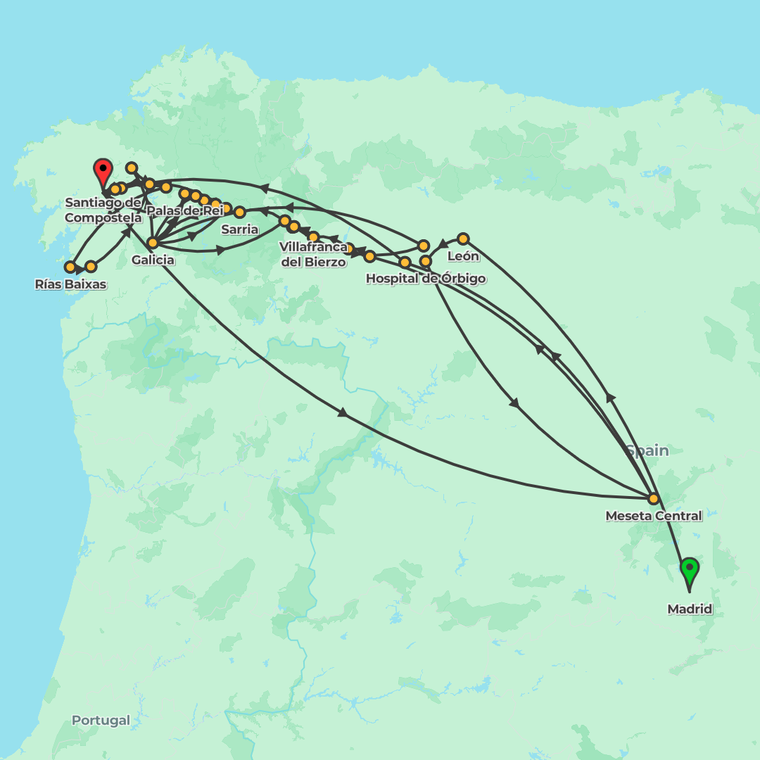 Follow in the footsteps of countless pilgrims, walking the legendary Camino Frances (French Way) from Leon to Santiago de Compostela