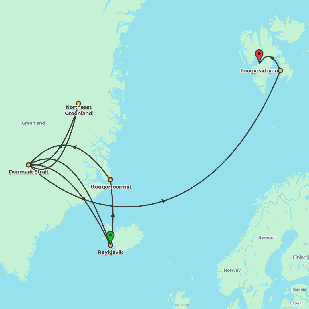 Sail from Longyearbyen to Reykjavík on a 15-day Arctic expedition featuring Svalbard, the Greenland Sea, Northeast Greenland’s fjord system including Scoresbysund, Zodiac excursions, lectures, whale v