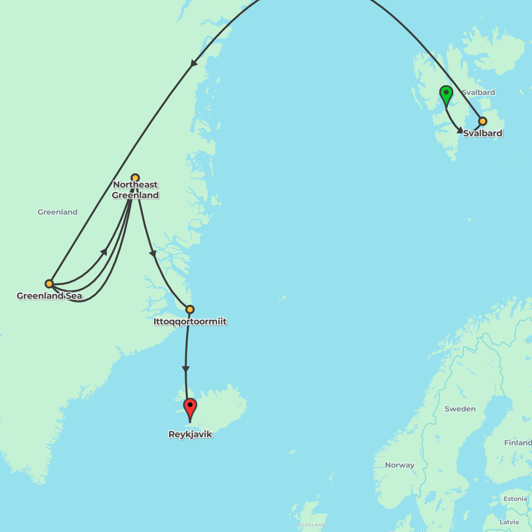 Cruise from Longyearbyen to Reykjavík on a 14‑night Arctic expedition exploring Svalbard and Northeast Greenland, with Zodiac outings, expert lectures, and a special opportunity to witness a shipboard