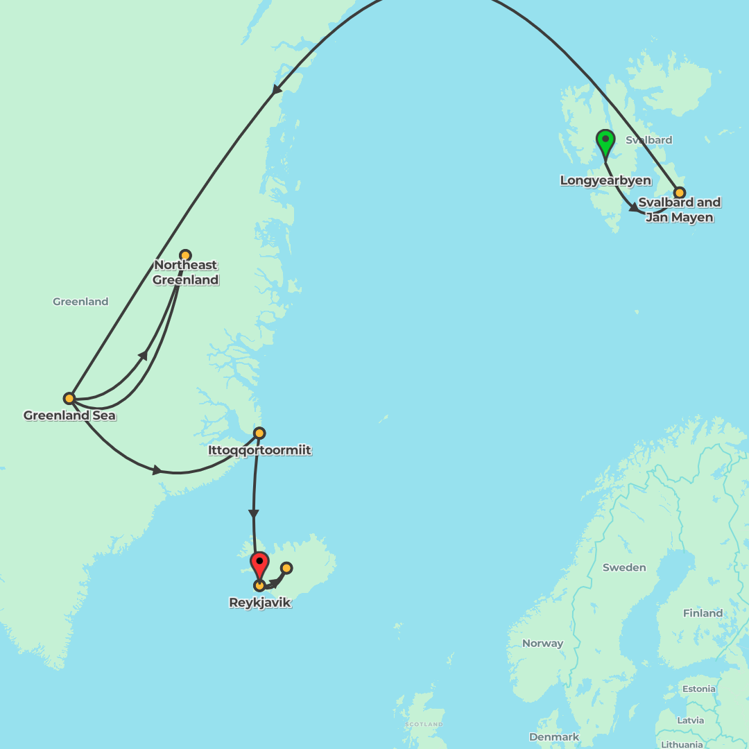 Sail from Longyearbyen to Reykjavík on a 15-day Arctic expedition featuring Svalbard, the Greenland Sea, Northeast Greenland’s fjord system including Scoresbysund, Zodiac excursions, lectures, whale v