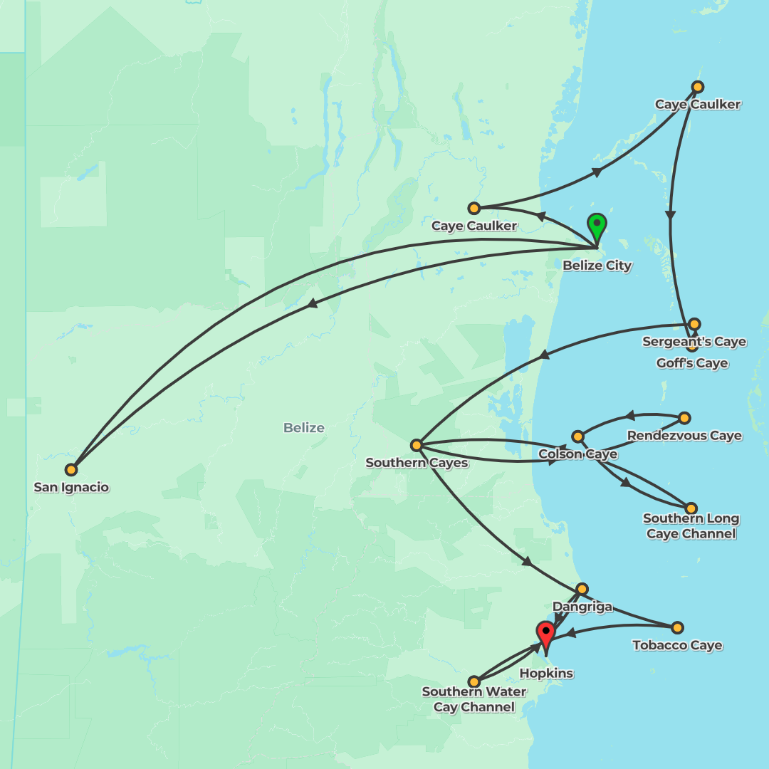 Sail Belize’s cayes, snorkel vibrant reefs, and enjoy free time from San Ignacio to Caye Caulker before wrapping up in Hopkins.