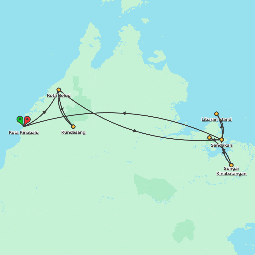 Discover Sabah’s rivers, rainforests, and islands on an 8-day small-group adventure from Kota Kinabalu, featuring Kinabatangan river safaris, Sepilok and a turtle conservation visit on Libaran Island,