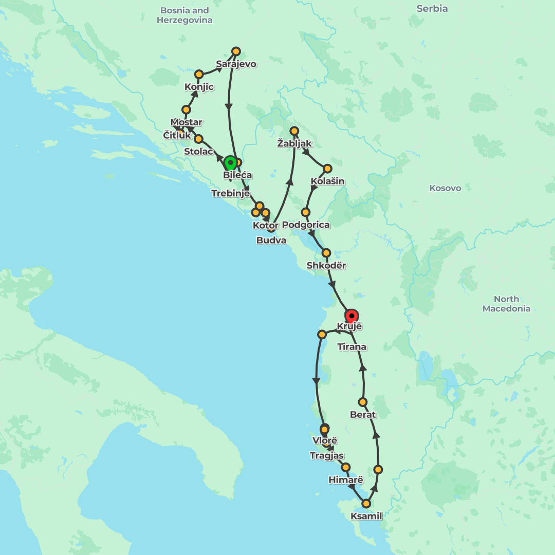 Discover the Balkans from Trebinje to Tirana on a small-group journey through Bosnia and Herzegovina, Montenegro and Albania, blending locally-run stays, private vehicle travel, scenic boat rides and