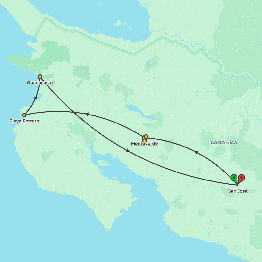 From volcano views and hot springs to cloud forests, beaches and wildlife-rich national parks, this Costa Rica adventure loops from San José through Arenal, Tamarindo, Monteverde and Jacó.