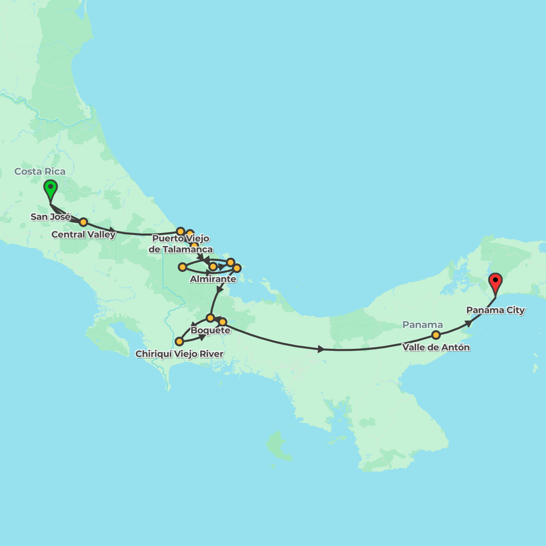 Cross from Costa Rica to Panama on a small-group 18-to-Thirtysomethings adventure from San José to Panama City, taking in Puerto Viejo, Bocas del Toro, Boquete and Valle de Antón, capped with a multi-
