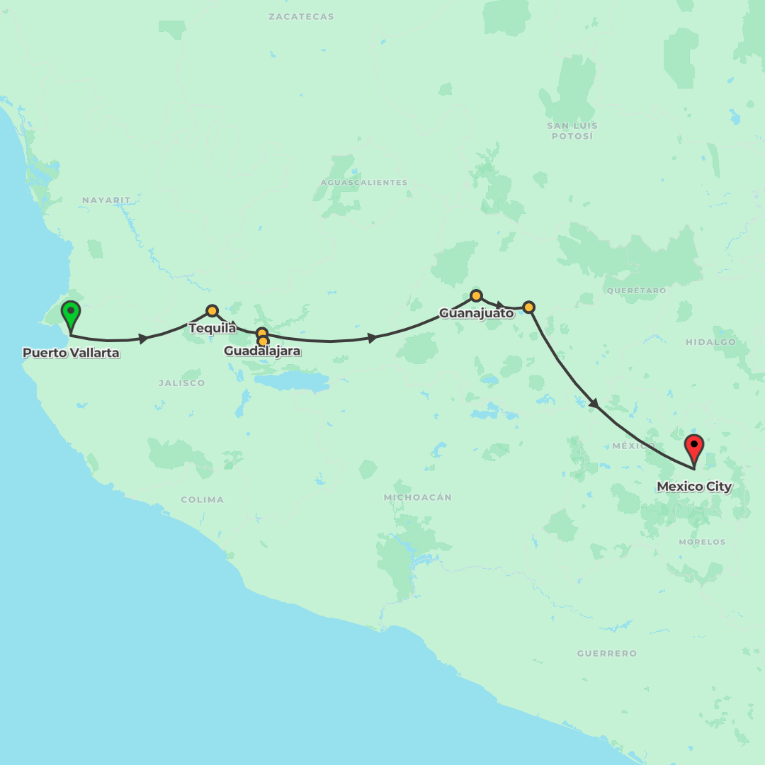 Discover central Mexico from Puerto Vallarta to Mexico City on a small-group trip featuring city tours, a tequila distillery visit, and generous free time in Guadalajara, Guanajuato, and San Miguel de