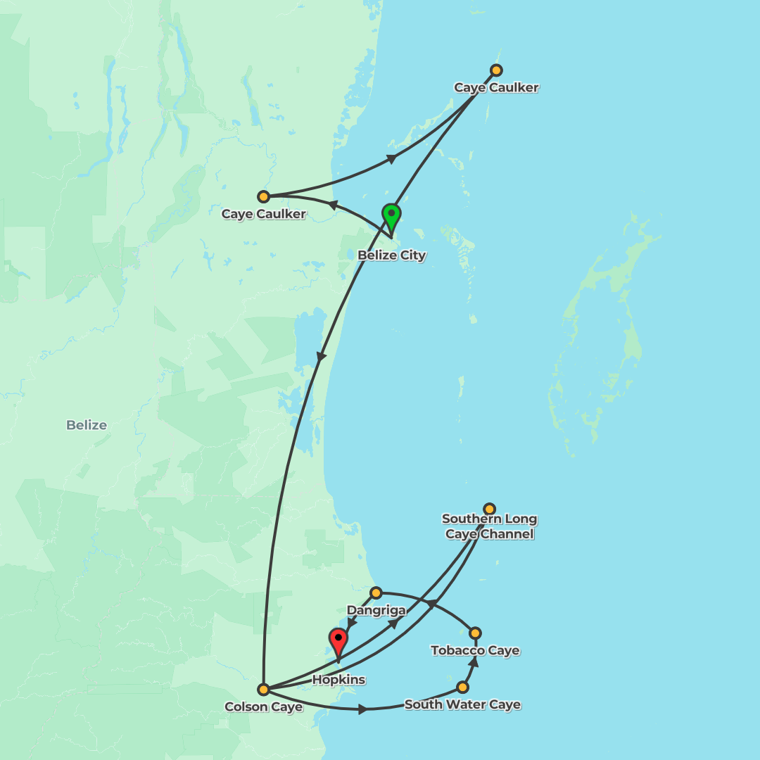Island-hop Belize’s cayes on a small-group sailing adventure from Belize City to Hopkins, with beach time in Caye Caulker, simple camping and dorm stays, and daily snorkelling.