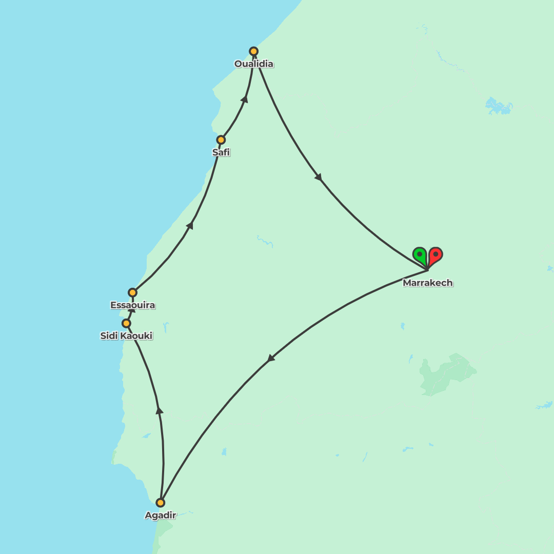 Explore Morocco’s Atlantic coast from Marrakech on a small-group adventure featuring Agadir, Sidi Kaouki and Oualidia, with sandboarding, markets and a local cooking experience.