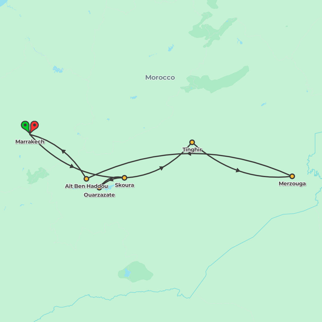 Explore Morocco’s oases, kasbahs, and Sahara dunes on a fast-paced small-group adventure from Marrakech, with camel rides, gorge walks, and medina highlights.