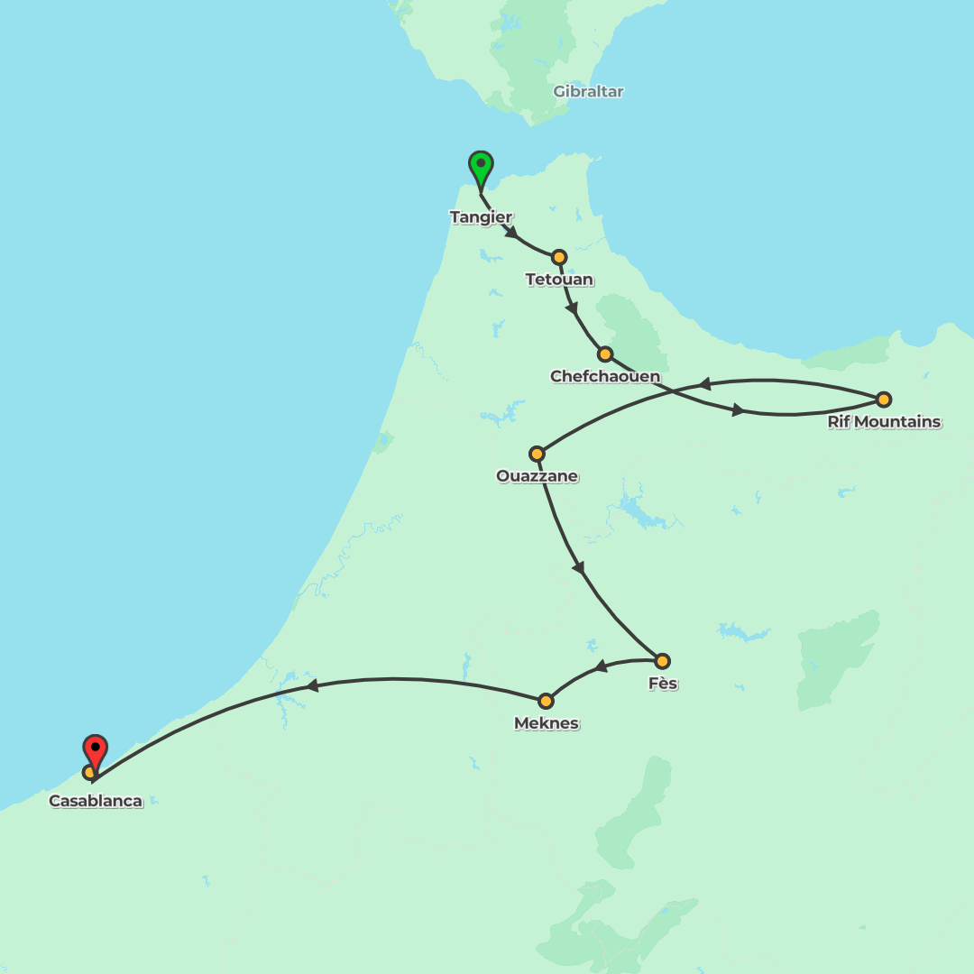 Explore northern Morocco from Tangier to Casablanca on a small-group adventure featuring guided city walks, a Rif Mountain hike with a local cheese-making experience, and time in Fès and Chefchaouen.