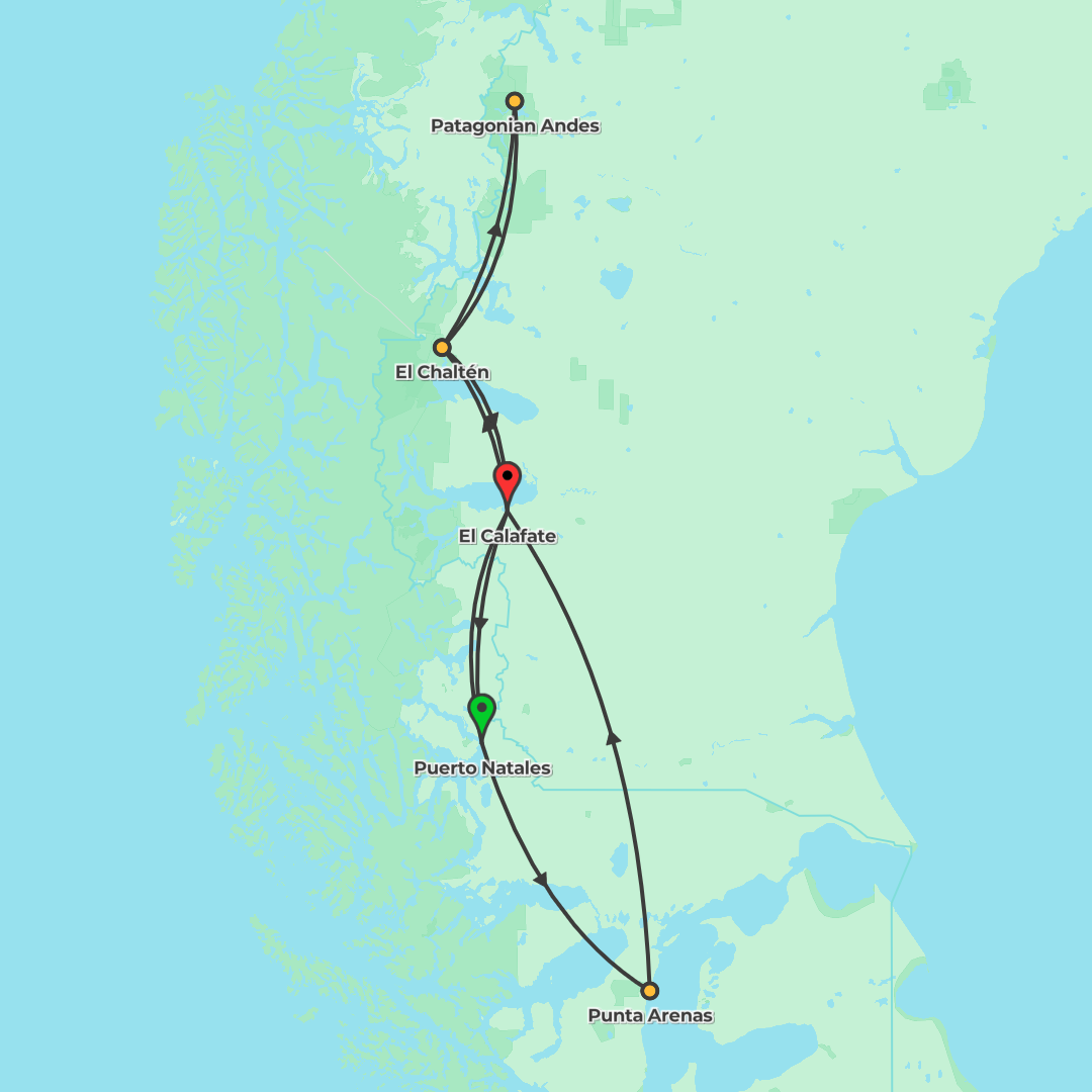 Travel from Santiago to Buenos Aires on a guided Patagonia journey featuring Torres del Paine, Los Glaciares, fjord and lake cruises, and time in Puerto Natales and El Calafate.