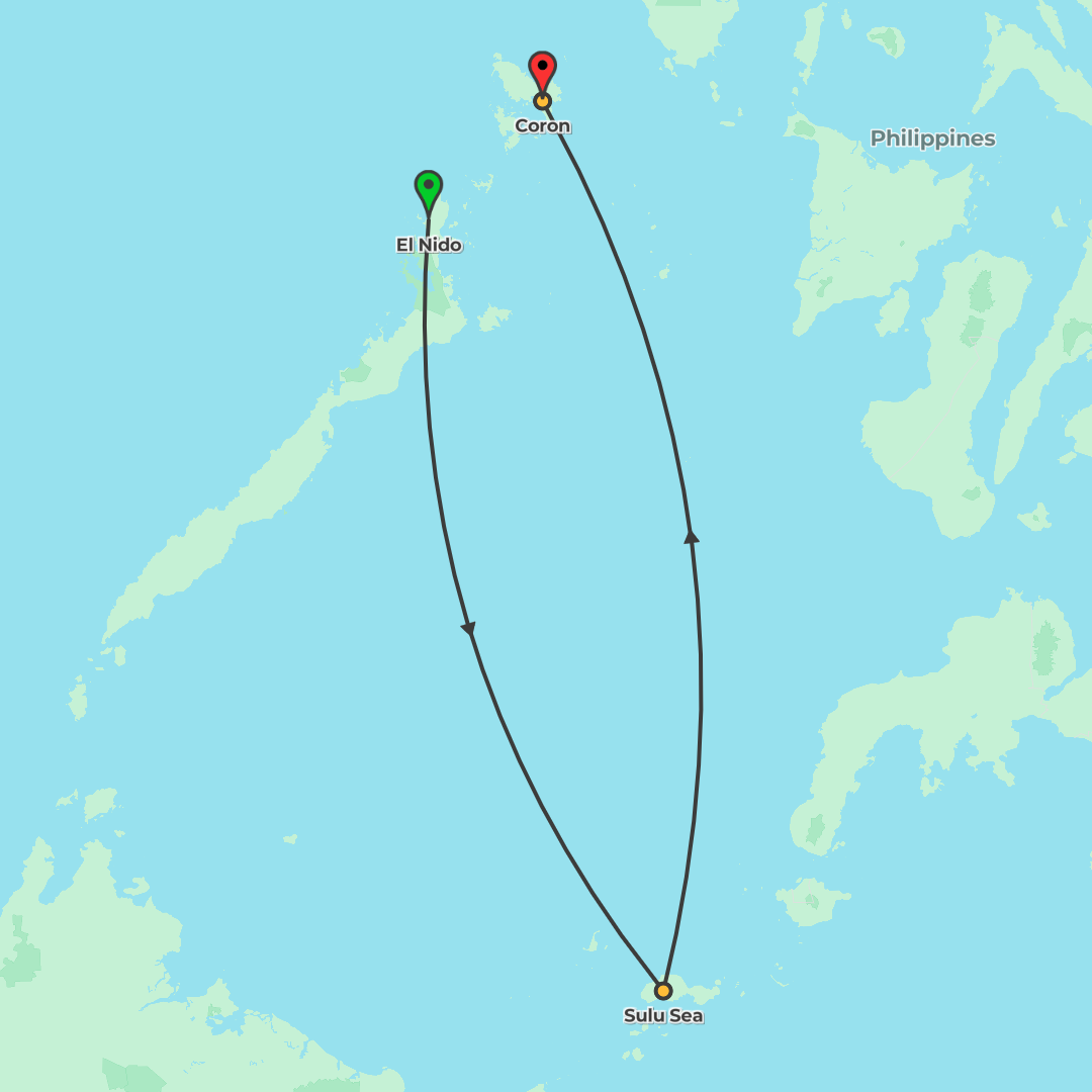 Island-hop from El Nido to Coron by bangka with beach bonfires, snorkeling, a Mt Tapyas hike, and Maquinit Hot Springs on a small-group Roamies adventure.