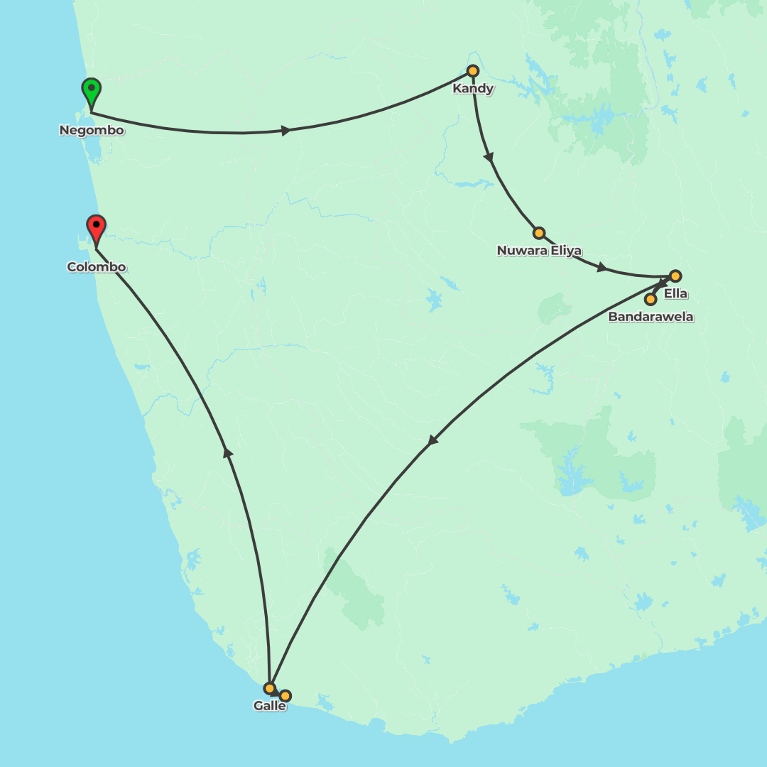 A fast-paced small-group journey from Negombo to Unawatuna, blending cultural highlights, tea country stays, and a wildlife safari across Sri Lanka.