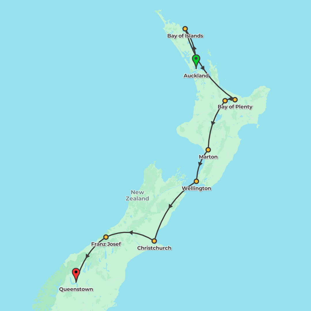 Discover New Zealand on a southbound adventure from Auckland to Christchurch, blending cultural highlights, wildlife encounters and free-time thrills across cities, lakes, volcanoes and coastlines.