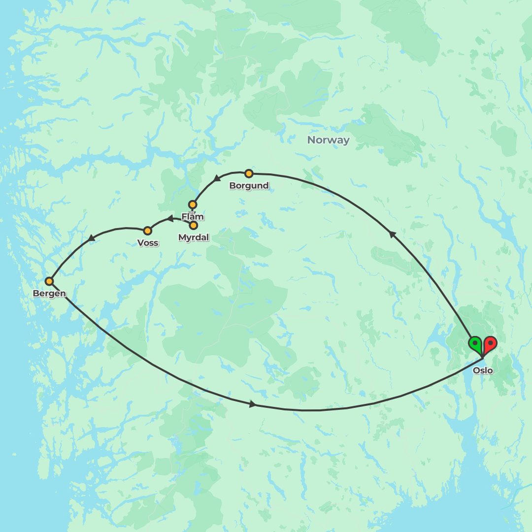 Explore Norway from Oslo to the western fjords, visiting coastal towns, crossing Hardangerfjord by ferry, cruising the Sognefjord Nærøyfjord, and riding the Flåm train on an escorted itinerary.