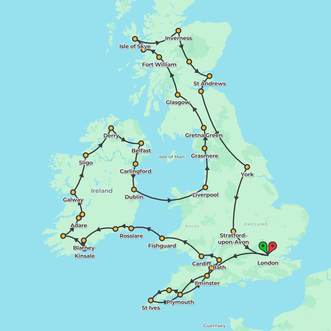 Discover Britain and Ireland on a guided coach journey from London through England, Scotland and the Highlands to Dublin, Donegal, Galway and Cardiff, with city orientations, Local Guides, ferry cross