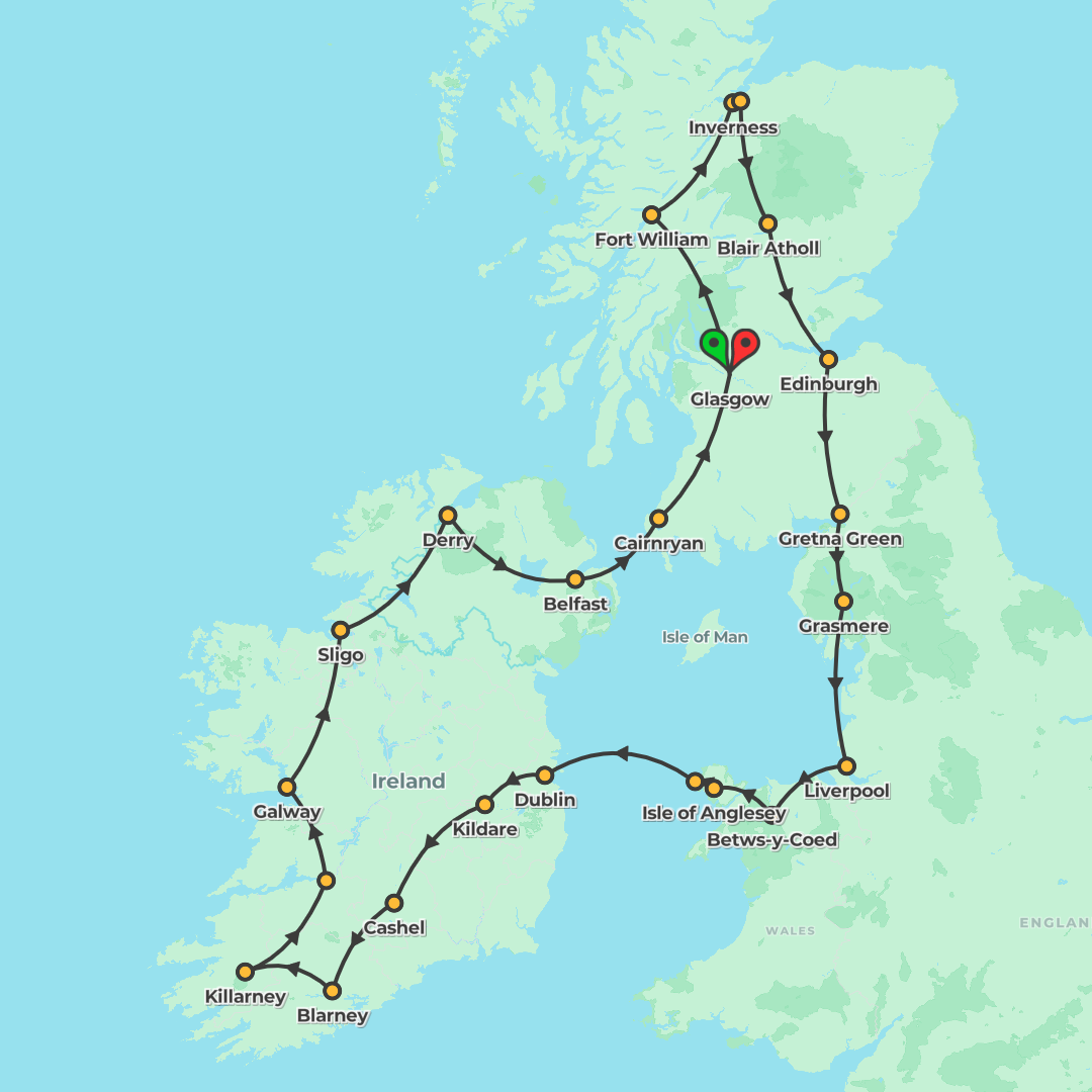 Discover Britain and Ireland on a guided coach journey from London through England, Scotland and the Highlands to Dublin, Donegal, Galway and Cardiff, with city orientations, Local Guides, ferry cross