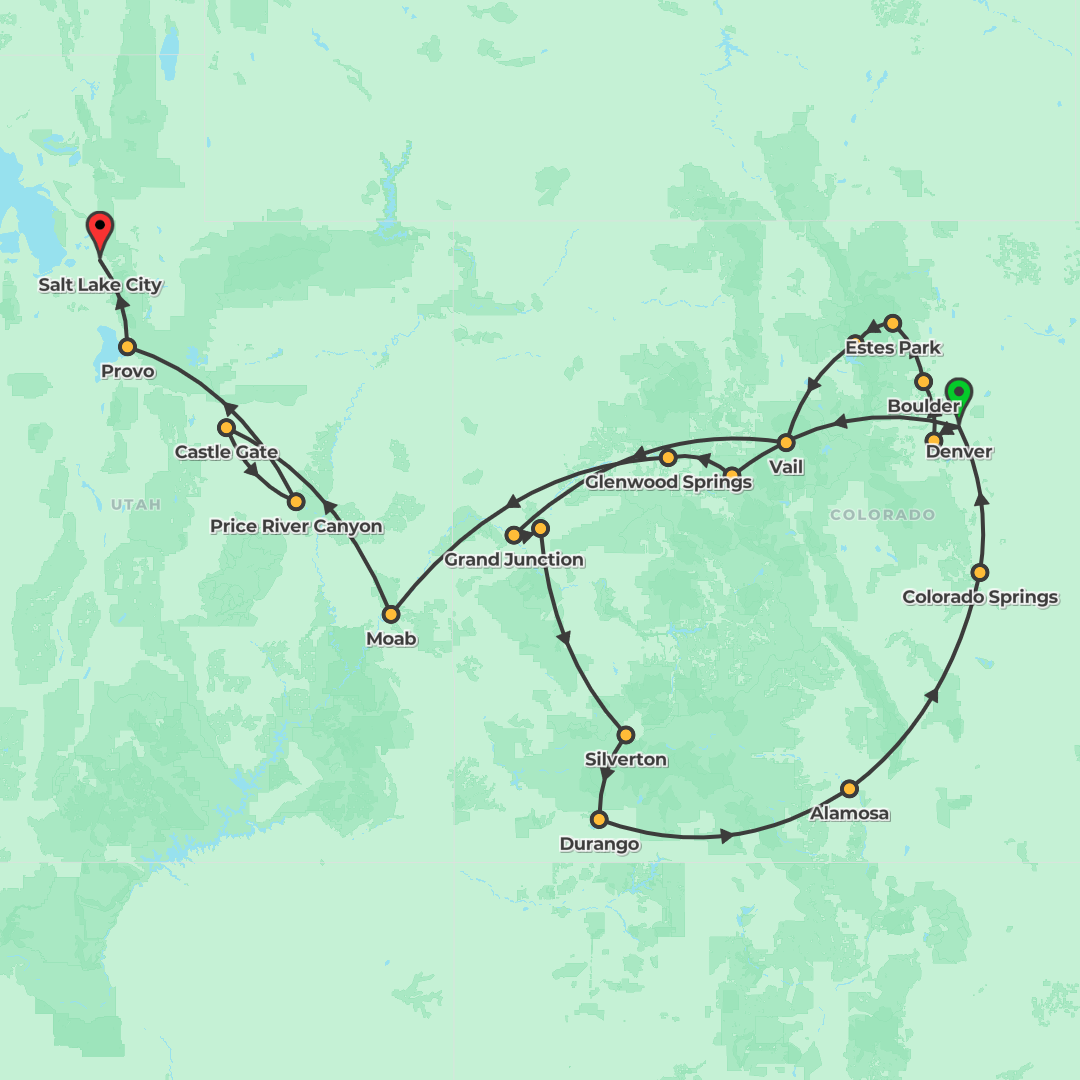 Explore Colorado’s national parks and mountain towns, ride iconic rail journeys, and finish in Salt Lake City on a 14-day adventure beginning in Denver.