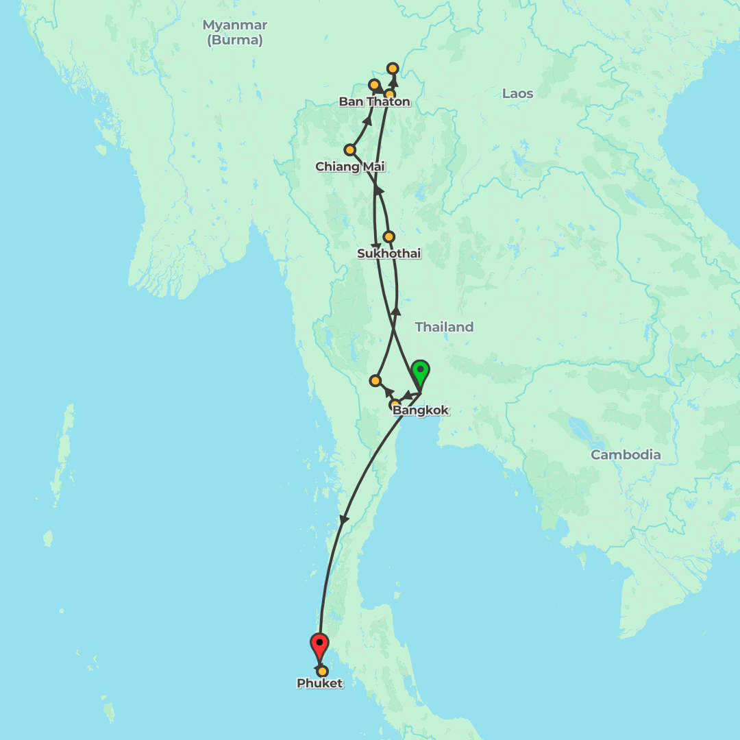 Experience a premium journey through Northern Thailand from Bangkok to Chiang Mai, featuring temples and canals, Ayutthaya’s heritage, Sukhothai by bike, a Feature Stay at Lisu Lodge, and time with re