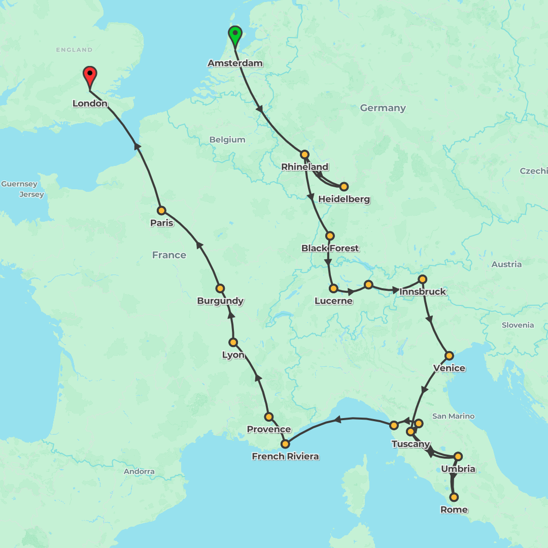 Explore a 3‑week discovery from Amsterdam to London through the Rhine Valley, the Alps, Italy and the French Riviera, finishing with a Eurostar extension.