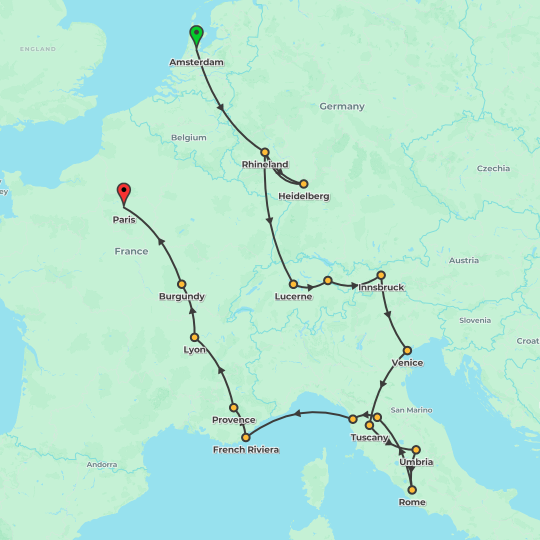 Journey from Amsterdam to Paris via the Rhineland, Lucerne, Innsbruck, Venice, Rome, Florence, Pisa, the French Riviera, and Lyon, with canal and river cruises, guided city sightseeing, scenic drives,