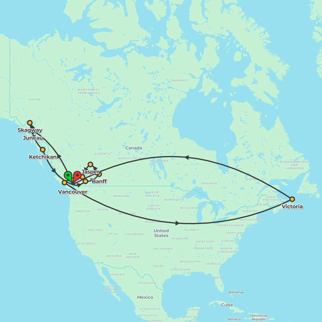 From Vancouver, trace a scenic loop to Victoria, Whistler, Jasper, Lake Louise, Banff and the Okanagan, blending guided highlights with ample free time and Choice Experiences across the Canadian Rocki