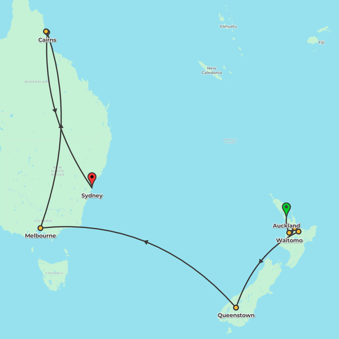 Discover New Zealand and Australia on a guided coach adventure from Auckland to Cairns with included intra‑tour flights, city orientation tours, and abundant Choice Experiences to shape each day your